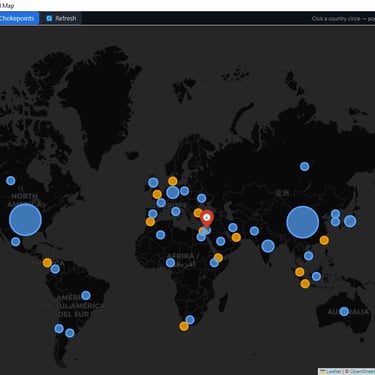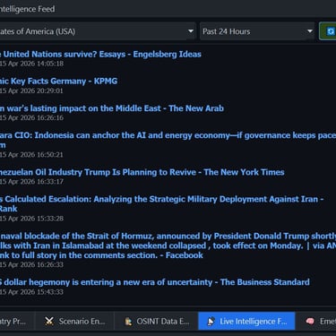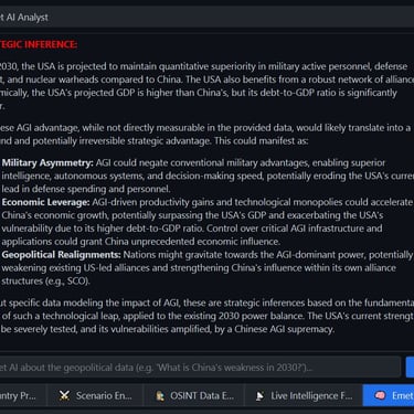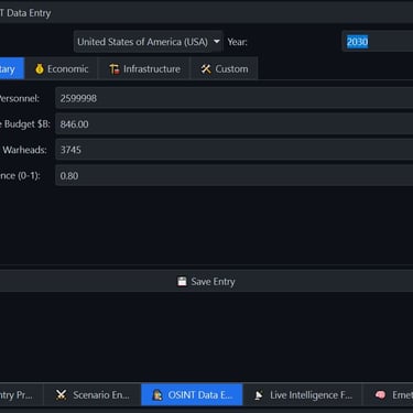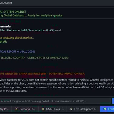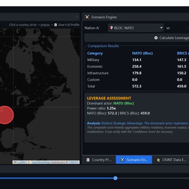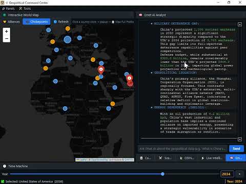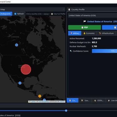 Geopolitical Command Center- a windows based simulator of geopolitical military, economic and other metric for world countries. The command center contains a dynamic map, with chokepoints [straight of Hormuz] and alliances and a "Time Machine" that allows viewing past data, yearly progression and simulating future data. The app contains hundreds of data point for major world countries from the year 1990 to the present. The app includes a scenario engine that calculates leverage between countries and blocs[NATO vs BRICS], the ability to enter custom values and export country profiles to PDF/DOCX. Furthermore, the app has a Live Intelligence Feed for all major countries with clickable web links and an AI analysis engine that allows asking questions related to Geo-politics analysis and future conjectures using real world data.